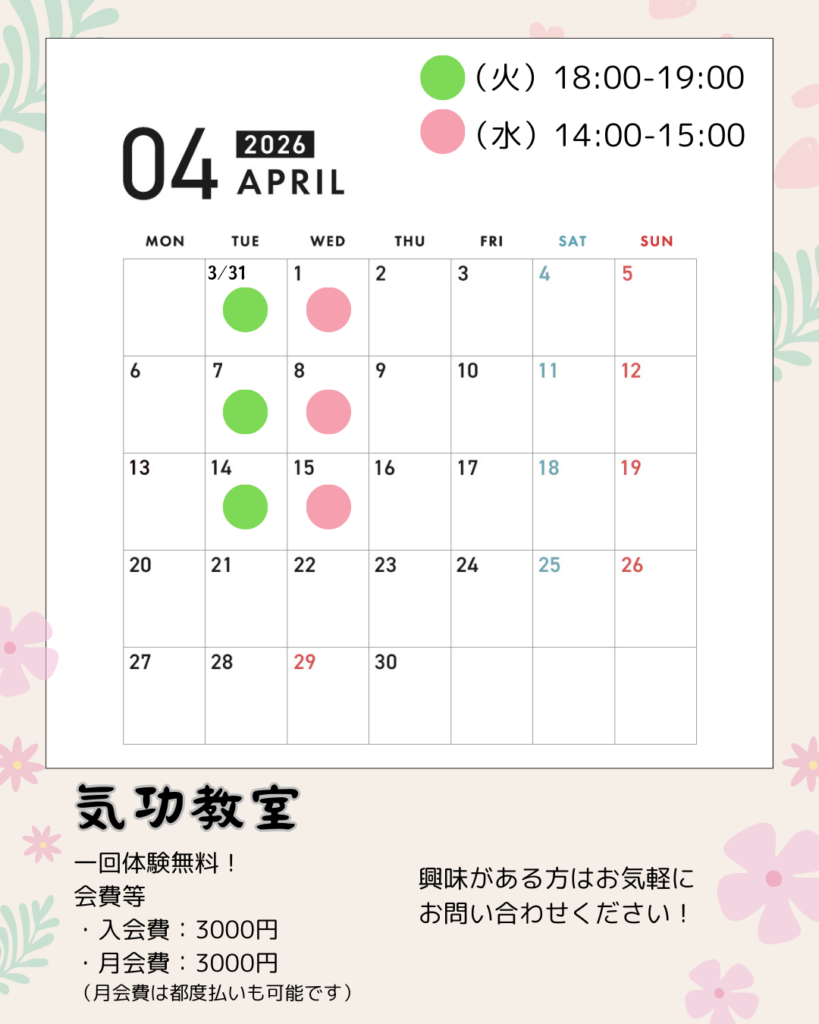 大阪市大正区にあるカルチャースペース元氣!2026年3月の気功体操教室のスケジュールをお知らせします。