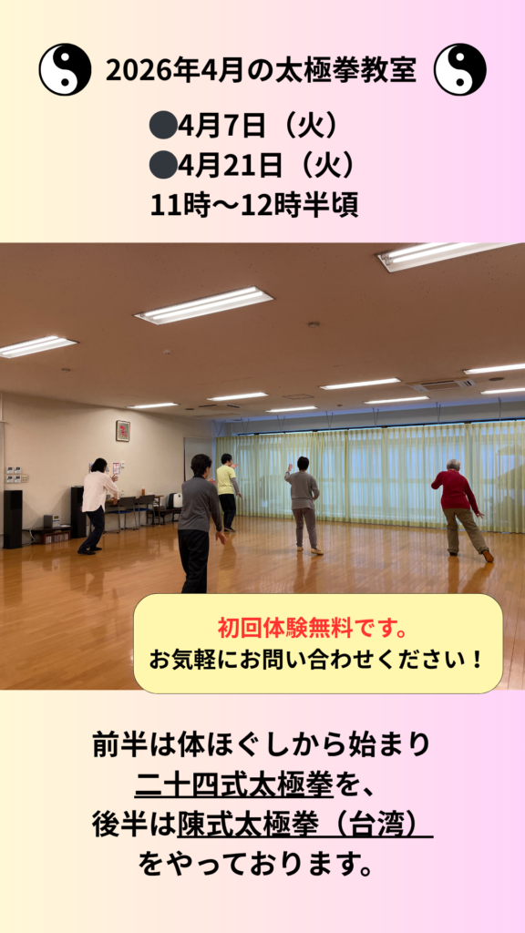 2026年4月の太極拳教室のスケジュールをお知らせいたします。
